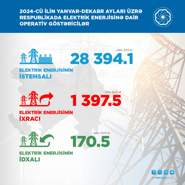 Energetika Nazirliyindən AZƏRTAC-a bildirilib ki, 12 ay ərzində elektrik enerjisi istehsalı İES-lərdə 24 543,2 milyon kilovat-saat, SES-lərdə 3 milyard 11 milyon kilovat-saat, digər mənbələr üzrə isə 839,9 milyon kilovat-saat təşkil edib. Bu dövrdə külək elektrik stansiyalarında 51,1 milyon kilovat-saat, günəş elektrik stansiyalarında 556,3 milyon kilovat-saat, Bərk Məişət Tullantılarının Yandırılması Zavodunda isə 232,5 milyon kilovat-saat elektrik enerjisi istehsal edilib.