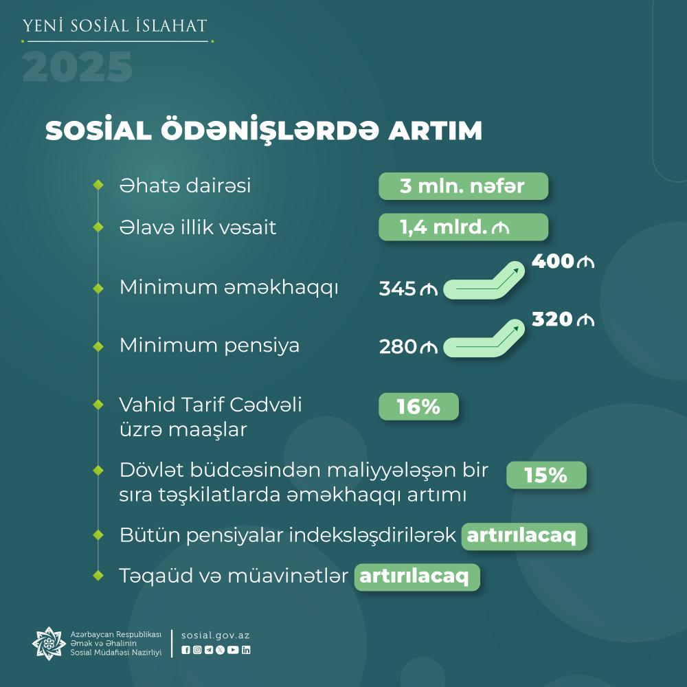 Ölkəmizin iqtisadi imkanlarının artması nəticəsində vətəndaşların sosialyönümlü rifahının yaxşılaşdırılması yönündə davamlı addımlar atılır, əlavə sosial rifah tədbirləri icra olunur. Bu siyasətin davamı kimi 2025-ci ildə minimum əməkhaqqı 14 faiz artırılıb, Vahid Tarif Cədvəli (VTC) üzrə orta əməkhaqqı sosial, elm, mədəniyyət, gənclər və idman, kənd təsərrüfatı, ekologiya və ətraf mühitin mühafizəsi, mənzil-kommunal, nəqliyyat və rabitə, meliorasiya, su təsərrüfatı və balıqartırma sahələrində 800 min vətəndaşın sosial həyatına müsbət təsir edib. Həmçinin 1,2 milyondan artıq əmək pensiyaçısının təqaüdlərinin artırılması təmin edilib. Eyni zamanda, ünvanlı sosial yardımın və minimum pensiya məbləğləri də artırılıb. Bir sıra sahələrdə çalışan dövlət orqanı əməkdaşlarının maaşlarının artımı gerçəkləşib.