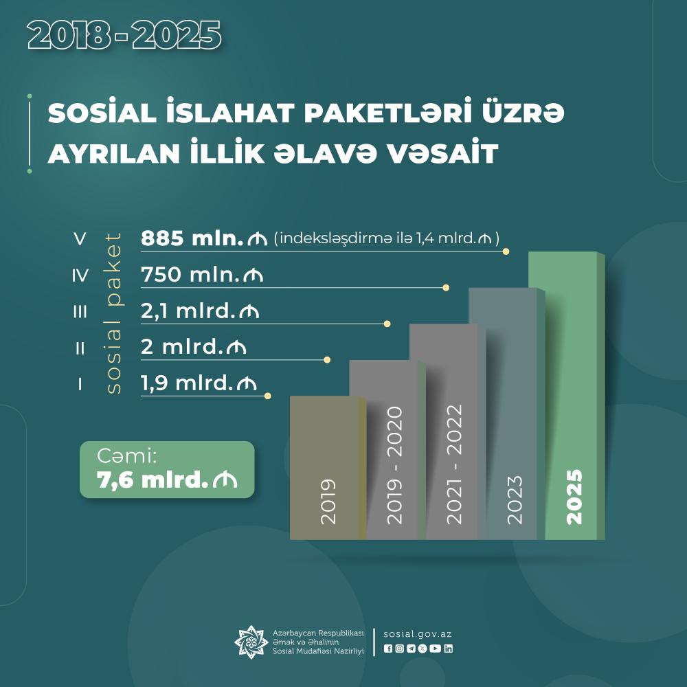 Azərbaycanda əhalinin sosial müdafiəsinin gücləndirilməsi, məşğulluq imkanlarının artırılması, əmək münasibətlərinin inkişafı, sosial sahədə xidmətlərin elektronlaşması, operativliyin və şəffaflığın təmin edilməsi istiqamətində ardıcıl islahatlar həyata keçirilir. Sosial sahədə aparılan məqsədyönlü siyasətin nəticəsi olaraq, 2018-2025-ci illərdə ölkəmizdə beş böyük sosial islahat paketi həyata keçirilib. Bu barədə əmək və əhalinin sosial müdafiəsi naziri Anar Əliyev “Rəqəmsallaşma və süni intellektin iş yerlərinə təsiri” mövzusunda keçirilən konfransda bildirib. Nazir qeyd edib ki, islahatların illik əlavə maliyyə tutumu 7,6 milyard manat olmaqla, 4 milyon nəfəri əhatə edib. Nəticədə həmin dövrdə minimum əməkhaqqı 3,1 dəfə, minimum pensiya 2,9 dəfə, orta aylıq pensiya isə 2,6 dəfə artıb. Sosial müavinət və təqaüd ödənişlərinin həcmi isə 5 dəfə artaraq 400 milyon manatdan 1,9 milyard manata çatıb.