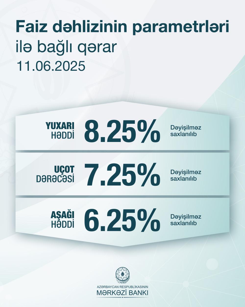 Mərkəzi Bankın (AMB) İdarə Heyətinin qərarı ilə uçot dərəcəsi 7,25 faiz, eyni zamanda, müvafiq olaraq, faiz dəhlizinin aşağı həddi 6,25, yuxarı həddi isə 8,25 faiz səviyyəsində dəyişməz saxlanılıb. Yəni MB 40 gün əvvəl açıqladığı sonuncu qərarından sonra uçot siyasətində yenə də dəyişiklik etməyib. Uçot dərəcəsinin dəyişməz saxlanılması ilə bağlı qərar faktiki və proqnozlaşdırılan inflyasiyanın hədəfdə (4±2 faiz) olması, inflyasiyanın daxili və xarici amillərinin dinamikası nəzərə alınmaqla qəbul olunub.
