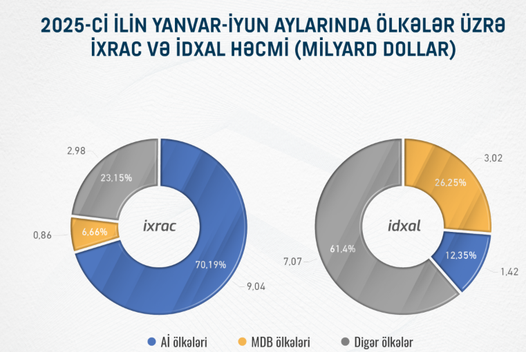 2025-ci ilin yanvar-iyun aylarında Azərbaycan Respublikasının hüquqi və fiziki şəxsləri dünyanın 166 ölkəsindəki tərəfdaşları ilə ticarət əməliyyatları həyata keçirib, 104 ölkəyə məhsul ixrac olunub, 160 ölkədən idxal edilib. Qeyd edilən dövrdə xarici ticarət dövriyyəsi 24 milyard 400 milyon dollara bərabər olub. Qeyd edilən dövrdə ixracın dəyəri 12 milyard 878 milyon dollar, idxalın dəyəri 11 milyard 522,1 milyon dollar təşkil edib, nəticədə 1 milyard 356 milyon dollarlıq müsbət ticarət saldosu yaranıb.