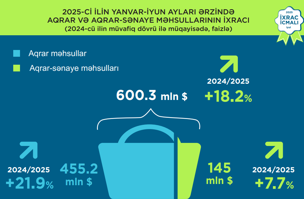 Qeyri-neft ixracında aqrar məhsulların ümunmi ixracı 21,9 faiz artaraq 455,2 milyon dollar təşkil edib. Aqrar-sənaye məhsullarının ixracı isə 7,7 faiz artaraq 145 milyon dollara bərabər olub. Bütövlükdə, aqrar və aqrar-sənaye məhsullarının birgə ixracı 18,2 faiz artaraq 600,3 milyon dollar təşkil edib.