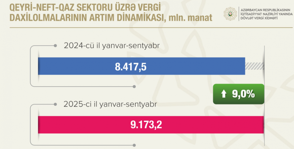 Bu dövrdə büdcə gəlirlərində əsas fiskal sütun kimi qeyri-neft mənbələri əsaslı resurs bazası olub. Qeyri-neft-qaz sektorunda daxilolmalar 9 milyard 173,2 milyon manat olub, əvvəlki ilin müvafiq dövrü ilə müqayisədə bu sektordan vergi daxilolmaları 755,7 milyon manat və ya 9 faiz artıb. Ödənilən vergilərin 73,6 faizi qeyri-neft-qaz sektorunun, 26,4 faizi isə neft-qaz sektorunun payına düşüb.