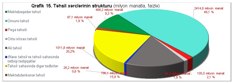 Təhsil xərc bölməsi üzrə proqnozlaşdırılan vəsaitin 2 milyard 414,8 milyon manatı və ya 48,1 faizi ümumi təhsil xərclərinə, 796,1 milyon manatı və ya 15,9 faizi ali təhsil və dövlət sifarişi ilə ali təhsilin maliyyələşdirilməsinə, 468,2 milyon manatı və ya 9,3 faizi məktəbəqədər təhsil xərclərinə, 94,2 milyon manatı və ya 1,9 faizi orta ixtisas təhsili xərclərinə, 105,5 milyon manatı və ya 2,1 faizi peşə təhsili xərclərinə, 97,1 milyon manatı və ya 1,9 faizi məktəbdənkənar təhsil müəssisələrinin (idman məktəbləri və s.) xərclərinə, 28,2 milyon manatı və ya 0,6 faizi əlavə təhsil və tətbiqi tədqiqatlara, 1011,8 milyon manatı və ya 20,2 faizi təhsil sahəsində digər müəssisə və tədbirlərlə bağlı xərclər üçün nəzərdə tutulub. Növbəti ildə dövlət sifarişi və dövlət hesabına kadr hazırlığı üzrə təhsil alanların sayı 150 min nəfərə, təqaüd alanların sayı isə 121 min nəfərə çatacaq. Gələn il əlilliyi olan, valideyn himayəsindən məhrum olmuş, şəhid ailələri və müharibə veteranı statusu almış güzəştli kateqoriyaya aid olan 18,5 min tələbənin təhsil və təqaüd xərcləri üçün 42 milyon manat vəsait proqnozlaşdırılıb.