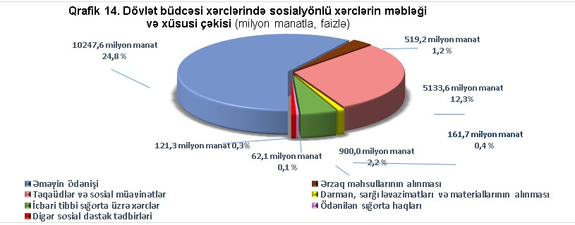 İqtisadi təsnifata uyğun olaraq 2026-cı il dövlət büdcəsində əməyin ödənişi xərclərinə 10 milyard 247,6 milyon manat vəsait ayrılacq ki, bu da 2025-ci illə müqayisədə 524,7 milyon manat və ya 5,4 faiz çoxdur. Sösialyönümlü xərclərin tərkibində əhalinin sosial müdafiəsinin gücləndirilməsinə xidmət edən təminat xərcləri isə, 9 milyard manat vəsait nəzərdə tutulub. Bu, 2025-ci ilə nisbətən 121 milyon manat, 2024-ci ilin icra göstəricisinə nisbətən isə 722 milyon manat çoxdur. Əhalinin gəlir əldə etmək imkanlarının və rifahının yaxşılaşması, yoxsulluq səviyyəsinin azaldılması, aztəminatlı ailələrin, xüsusilə də sosial cəhətdən həssas təbəqələrin sosial müdafiəsinin gücləndirilməsi və digər sosial tədbirlərin maliyyə təminatı üçün 2026-cı ilin dövlət büdcəsinin layihəsində 2 milyar 750,9 milyon manat vəsait nəzərdə tutulub. Yaşa, əlilliyə, ailə başçısını itirməyə və digər sosial müavinətlərin və müharibə əlillərinə, ümumi səbəbdən əlilliyi olan şəxslərə, müharibə veteranlarına, şəhid ailələrinə ödənilən Azərbaycan Respublikası Prezidentinin təqaüdlərinin maliyyələşdirilməsi üçün 2 milyard 144,7 milyon manat (2025-ci ilə nisbətən 201,8 milyon manat və ya 10,4 faiz çox), ünvanlı dövlət sosial yardımlarının verilməsi üçün 465 milyon manat, haqqı ödənilən ictimai işlərlə bağlı xərclər üçün 141,2 milyon manat vəsait proqnozlaşdırılıb.