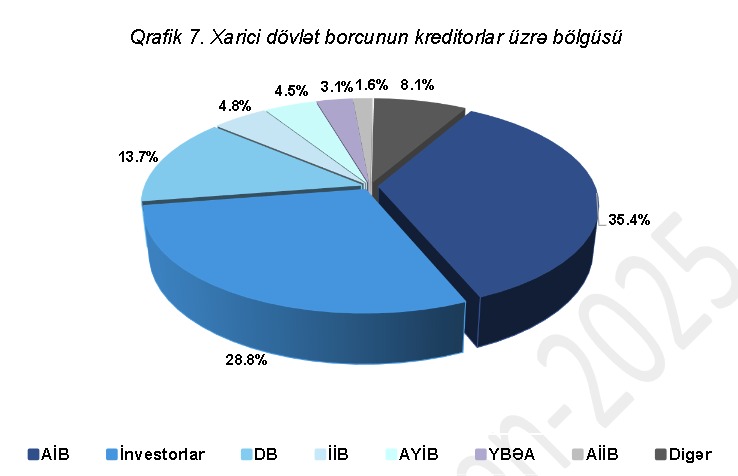 Borc siyasəti üzrə əldə edilən ən mühüm nəticə xarici borcun davamlı azaldılmasıdır. Rəqəmlərdən də göründüyü kimi Azərbaycanın xarici borcu ümumi borcun 31,5 faizinə bərabər olmaqla təxminən 8,2 milyard manat təşkil edir. Bu, dollar ifadəsi ilə 4,8 milyard dollar deməkdir. Bu rəqəm ÜDM-in 6,3 faizini təşkil edir. Xarici dövlət borcu 2025-ci ilin əvvəli ilə müqayisədə mütləq ifadədə 316,2 milyon dollar və ya 6,2 faiz azaldılıb.