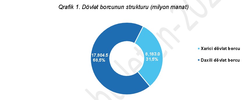 Qeyd olunub ki, 1 yanvar 2026-cı il tarixinə Azərbaycanın dövlət borcunun ümumi məbləği 25 milyard 987,5 milyon manat təşkil edərək ÜDM-in 20,1 faizinə bərabər olub. Bu, ötən ilin əvvəli ilə müqayisədə 5,1 faiz və ya 1,4 milyard manata yaxın azalma deməkdir. Dövlət borcunun 31,5 faizi xarici, 68,5 faizi isə daxili borcun payına düşür. Dövlət zəmanətli borcların həcmi də azalaraq 10 milyard 368,4 milyon manat və ya ÜDM-in 8 faizi səviyyəsində qərarlaşıb.