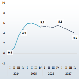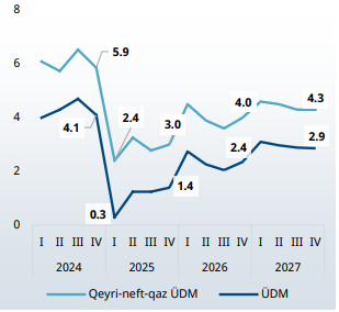 Mərkəzi Bankın 2026-cı ilin fevral proqnozlarına əsasən cari ildə real iqtisadi artımın ümumi ÜDM üzrə 2,4 faiz, qeyri-neft-qaz ÜDM üzrə isə 4 faiz olacağı gözlənilir. Proqnozlara əsasən, cari ildə qeyri-neft-qaz sektorunda artımın əsas drayverləri ev təsərrüfatlarının son istehlak xərcləri, mal və xidmətlərin xalis ixracı və əsas fondların ümumi yığımının olacağı fərz edilir. 2027-ci ildə isə qeyri-neft sektorunun artımını 2026-cı ildə olduğu kimi, ev təsərrüfatlarının son istehlak xərcləri, mal və xidmətlərin xalis ixracı və əsas fondların ümumi yığımı şərtləndirəcək.