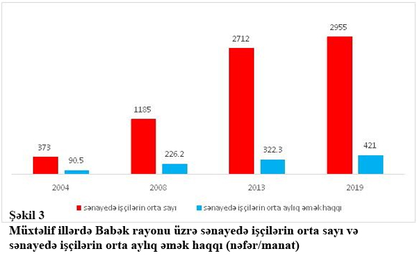 Buradan da aydın olur ki, ölkədə və onun bütün regionlarında olduğu kimi, Naxçıvan Muxtar Respublikasında və Babək rayonunda da sənaye iqtisadiyyatın zəruri səhəsi olaraq formalaşmış və bu dayanıqlı sənayeləşmə üçün baza olmuşdur. Hesablamalar göstərir ki, 2004-2019-cu illərdə Babək rayonunda sənayedə işçilərin orta sayı 8 dəfə artmışdır. Bu göstərici sənayedə işçilərin orta aylıq əmək haqqında da özünü göstərmiş və 4,7 dəfə təşkil etmişdir.
