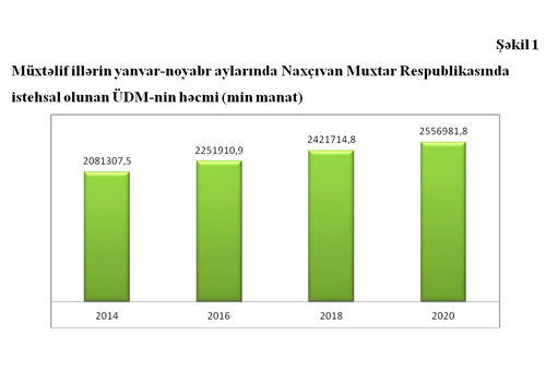 Artıq 2020-ci ilin də sonlarına doğru addımlamaqdayıq. Geridə qalan illərin və onların müvafiq dövrlərinin sosial-iqtisadi inkişafının təhlili göstərir ki, əldə olunan iqtisadi artım cari ilin də 11 ayı ərzində muxtar respublika iqtisadiyyatının müqavimətliliyini daha da artırmış, bu isə özünü onun dayanıqlılığının güclənməsində göstərmişdir. Bunu 2020-ci ilin yanvar-noyabr aylarının makroiqtisadi inkişaf göstəriciləri də ifadə etməkdədir. Qeyd edək ki, həmin 11 ay ərzində muxtar respublikada 2 milyard 556 milyon 981 min 800 manat həcmində Ümum Daxili Məhsul (ÜDM) istehsal olunmuşdur. (şəkil 1)
