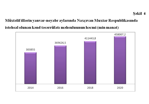 Kənd təsərrüfatının inkişaf etdirilməsi sahəsində muxtar respublikada davamlı tənzimləyici tədbirlər həyata keçirilməkdədir. Bu sahədə təkcə 27 noyabr 2020-ci il tarixində Naxçıvan Muxtar Respublikası Ali Məclisinin Sədri tərəfindən “kənd təsərrüfatı təyinatlı torpaqların münbitliyinin artırılması ilə bağlı tədbirlər haqqında” Sərəncamın imzalanmasını göstərmək olar. Bu, muxtar respublikanın ötən dövrlər ərzində topladığı aqrar potensial baxımından çox əhəmiyyətli olub həmin əsaslarla qarşıdakı dövrlərdə də yeni perspektivləri daha da artıracaq. Digər tərəfdən, torpaqların məhsuldarlığı və ondan istifadə sahəsində stimullaşdırıcı mexanizmlər sahəsindəki prosesləri sürətləndirəcək. Məlumdur ki, ötən 2019-cu il muxtar respublikada “Ailə Təsərrüfatları” ili elan olunmuşdur. Bu mənada, müvafiq Sərəncam təsərrüfatların istehsal imkanlarının artırılmasına, onların aqrotexniki vasitələrdən yararlanma sahəsindəki əlçatanlığına, bununla da, aqrar sektorda məşğulluq səviyyəsinin yüksəldilməsinə və eyni zamanda, demoqrafik tarazlıq sahəsinə hərəkətverici təsiri ilə seçiləcək. (şəkil 4)