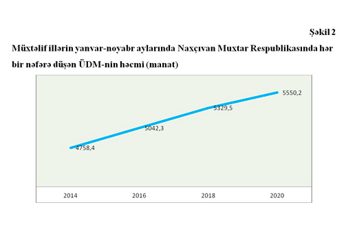 Təbii ki, davamlı inkişafın təmin olunması və bunun makroiqtisadi zəmində təşəkkülü cəmiyyət üzvlərinin artan tələbatlarının təmin olunmasına, onun sosial müdafiəsinin güclənməsinə, rifah göstəricilərinin daha da yaxşılaşmasına xidmət etməklə dövlətin sosial sahədəki hədəflərini daha da əlçatan etməkdədir. Məhz bu baxımdan da Naxçıvan Muxtar Respublikasında təmin olunan sosial-iqtisadi inkişaf güclü infrastruktur siyasətinin də etibarlı nəticələrinin ifadəsi olmaqla özünü istehsal və sosial sahələrin təşəkkülündə göstərməkdədir. Nəticə etibarilə, bütün bunlar, əhalinin alıcılıq qabiliyyətinin daha da artmasında, onların sosial-iqtisadi inkişafdakı iştirakının daha da çevik olmasında özünü təsdiq etmişdir. Məhz ÜDM-in hər bir nəfərə düşən həcminin də artan dinamikası və cari ilin 11 ayı ərzində 5500 manatı ötməsi bunun təsdiqi olaraq çıxış etməkdədir. (şəkil 2)