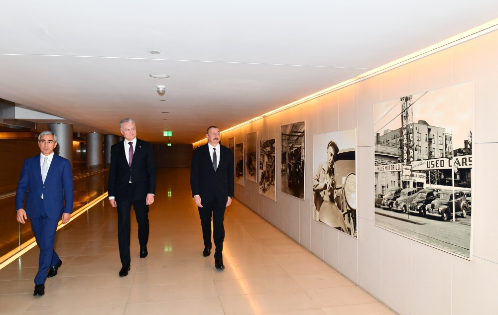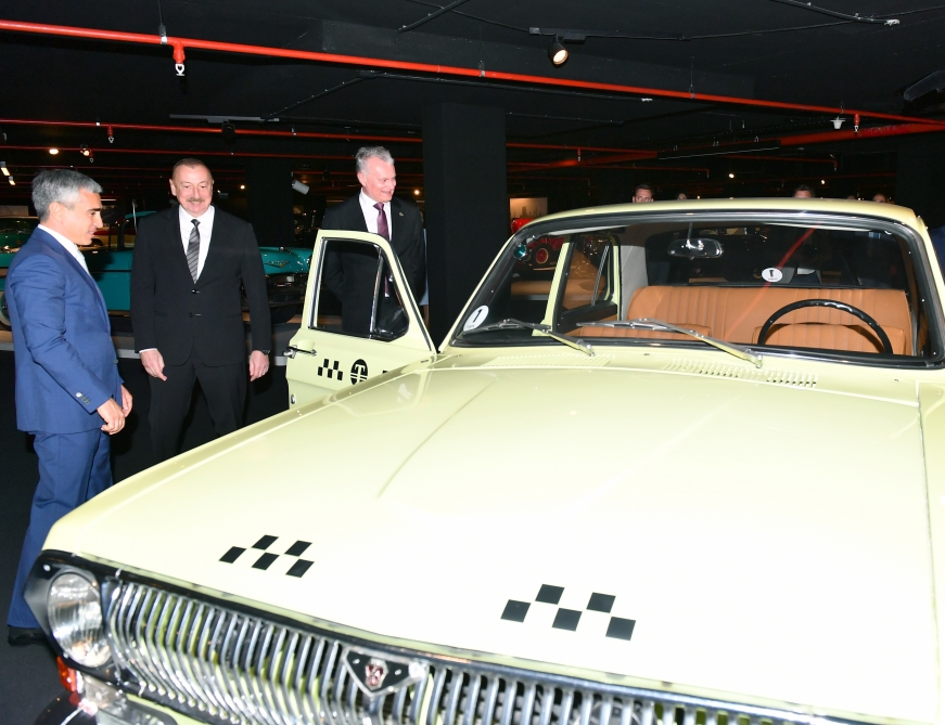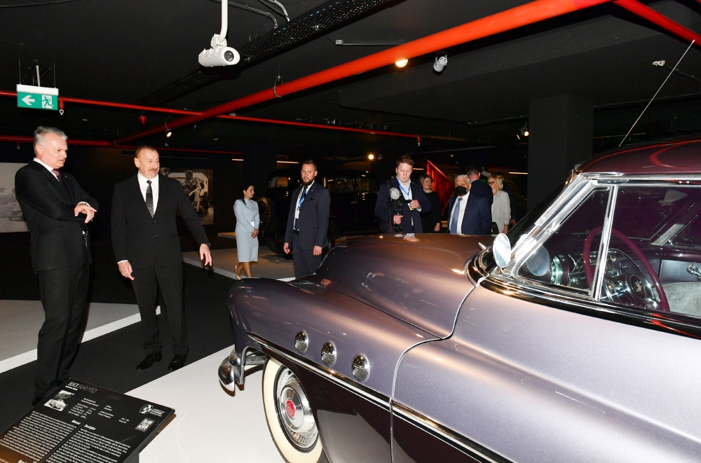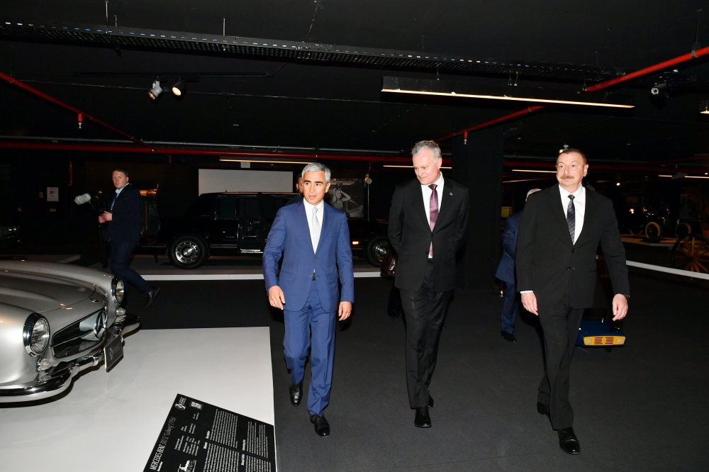Azərbaycan-Litva sənədlərinin imzalanması mərasimindən sonra dövlət başçıları Heydər Əliyev Mərkəzində klassik avtomobillərin sərgisi ilə tanış oldular.