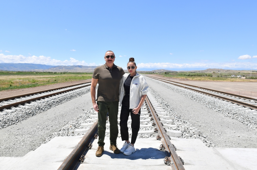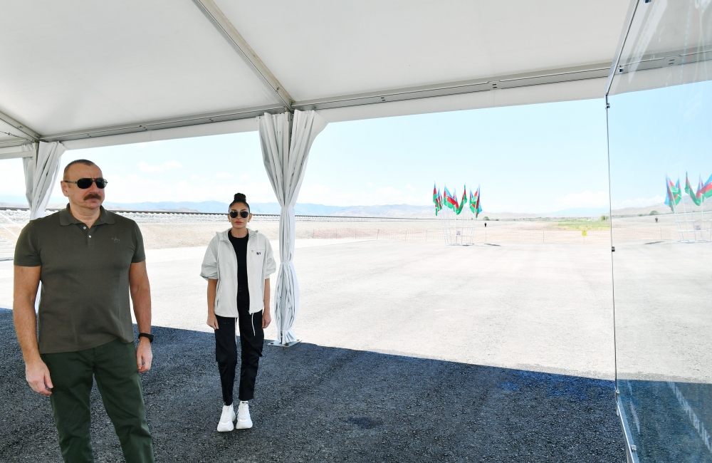 AZƏRTAC xəbər verir ki, dövlətimizin başçısı və birinci xanım Horadiz-Ağbənd dəmir yolu xəttinin Cəbrayıl rayonu ərazisində Soltanlı stansiyasının təməlqoyma mərasimində iştirak ediblər.