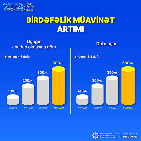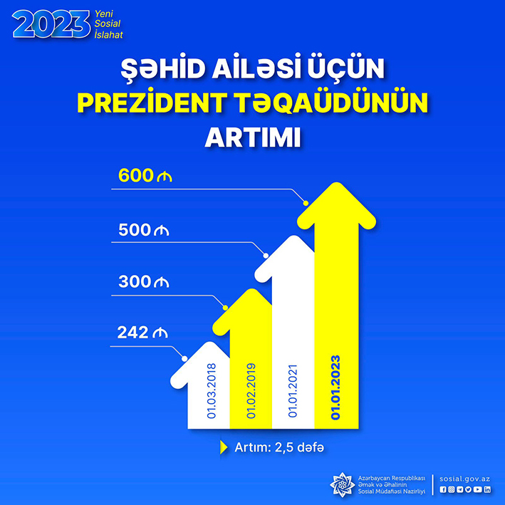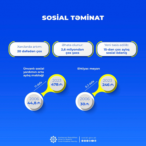 2023-cü ilin 11 ayı ərzində pensiya, müavinət, təqaüd və ünvanlı dövlət sosial yardımları üzrə əhaliyə ötən ilin müvafiq dövrünə nisbətən 1 mlrd. 224 mln. manat və ya 20,2 faiz çox olmaqla 7 mlrd. 285 mln. manat ödənilib. Bu ilin əvvəlindən növbəti sosial islahat paketi reallaşdırılaraq pensiya, müavinət və təqaüdlərin, habelə ehtiyac meyarı həddinin növbəti dəfə artırılması təmin edilib. Ötən il pensiyaçılara verilən maddi yardımlar da bu ilin əvvəlindən onların pensiyaları tərkibinə daxil edilərək, pensiyalar ötən il üzrə orta aylıq əməkhaqqının illik artım tempinə uyğun olaraq 2023-cü il yanvarın 1-dən 14,7 faiz indeksləşdirilərək artırılıb.