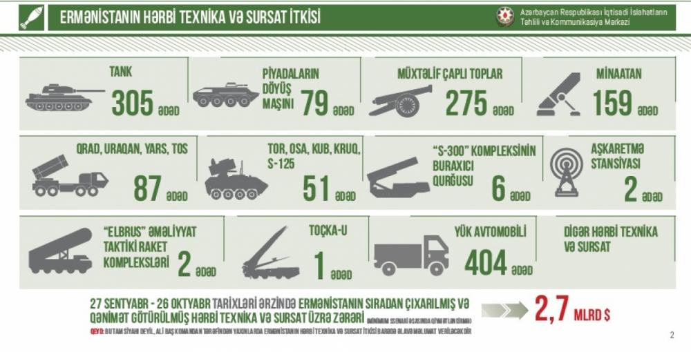 • Azərbaycan Ordusunun Ermənistan silahlı qüvvələrinin genişmiqyaslı təxribatlarına cavab olaraq, sentyabrın 27-də başladığı uğurlu əks-hücum əməliyyatı nəticəsində indiyədək düşmənin xeyli sayda döyüş texnikası, hərbi sursatı məhv edilərək sıradan çıxarılıb və qənimət götürülüb. Düşmənin ümumi itkiləri 2,7 milyard dollar dəyərində qiymətləndirilir - infoqrafika.