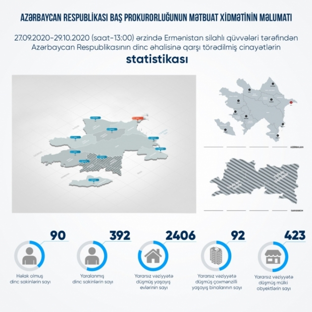 • Ermənistanın terror hücumları nəticəsində sentyabrın 27-dən oktyabrın 29-u saat 13:00-dək həlak olan mülki şəxslərin sayı 90-a çatıb, 392 nəfər xəsarət alıb. Bu barədə Baş Prokurorluq məlumat yayıb.