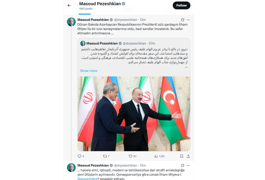 İran Prezidenti Məsud Pezeşkian Azərbaycana rəsmi səfərə gəlib