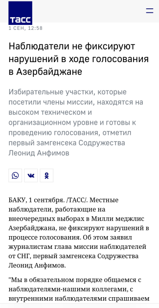 TASS agentliyi də parlament seçkilərinin gedişini ətraflı işıqlandırıb. MDB müşahidəçilər missiyasının üzvlərinin rəylərinin yer aldığı materialda bildirilir ki, səsvermə məntəqələri texniki cəhətdən mükəmməl təchiz olunub, Azərbaycan Mərkəzi Seçki Komissiyası, digər dövlət qurumları müşahidəçilər missiyası ilə əməkdaşlıq ediblər.