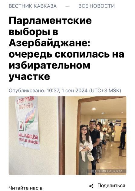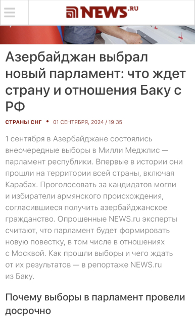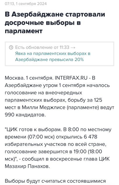 “Rossiyskaya qazeta” nəşri xatırladır ki, bu, Azərbaycanın ərazi bütövlüyünü bərpa etdikdən sonra keçirilən ikinci seçkilərdir. Azərbaycanda Prezident seçkilərinin fevral ayında reallaşdığı qeyd olunan materialda deputat mandatı uğurunda 990 namizədin mübarizə apardığı diqqətə çatdırılır.