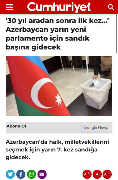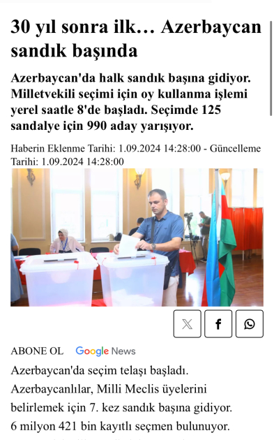 Xəbərlərdə vurğulanıb ki, Azərbaycanın erməni işğalından azad etdiyi bölgələrində də seçki qutuları yaradılıb ki, bununla da 30 ildən sonra ilk dəfə olaraq Azərbaycanın bütün ərazilərində parlament seçkiləri keçirilib.