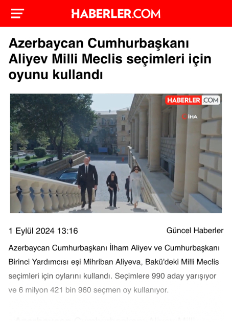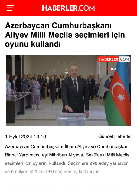 Xəbərlərdə, həmçinin Türkiyə Ali Seçki Qurumunun (YSK) sədri Ahmet Yenerin qardaş ölkə mediasına verdiyi müsahibəsi yer alıb. Bildirilib ki, YSK sədri müsahibəsində sentyabrın 1-nin Azərbaycan demokratiyası və tarixi üçün mühüm bir gün olduğunu vurğulayaraq deyib: “Qırx dörd gün davam edən İkinci Qarabağ müharibəsində qazanılan Zəfərdən sonra ölkədə ilk dəfə parlament seçkiləri bütün torpaqlarda keçirilir. Seçkilərin Azərbaycan xalqı və Türk dünyası üçün xeyirli olmasını arzulayıram. Seçkilərin nizamlı və şəffaf şəraitdə keçdiyini, azərbaycanlı qardaşlarımızın seçkiyə böyük əhəmiyyət verdiyini görürük. Bunu görmək bizim üçün sevindiricidir. Seçici fəallığı çox yüksəkdir”.