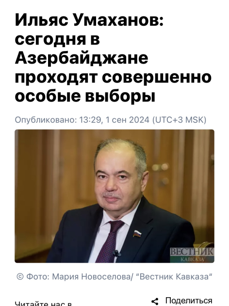 Rusiyalı müşahidəçilərdən biri, Rusiya Federasiya Şurasının Elm, Təhsil və Mədəniyyət Komitəsi sədrinin birinci müavini İlyas Umaxanov “Vestnik Kavkaza” agentliyinə müsahibəsində bu seçkilərin Azərbaycan üçün əhəmiyyətindən danışaraq səsvermənin ölkəmizin bütün suveren ərazisində keçirildiyini qeyd edib. O, azərbaycanlıların öz doğma torpaqlarına qayıtdıqlarını vurğulayaraq deyib: “Bu baxımdan biz bu gün Ümummilli Lider Heydər Əliyevin oğlu, Prezident İlham Əliyevə vəsiyyətinin yerinə yetirildiyinin şahidiyik”. O, Rusiyanın Azərbaycanın siyasətini tam dəstəklədiyini, Rusiya Prezidenti Vladimir Putinin Bakıya səfərinin iki ölkə arasında mehriban qonşuluq münasibətlərinin möhkəmlənməsinə töhfə verdiyini vurğulayıb.