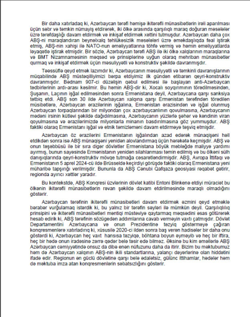 Azərbaycana qarşı irqi ayrı-seçkiliyi ehtiva edən, böhtanla dolu, dialoq ruhuna zidd olan, müharibə cinayətkarlarının azadlığa buraxılmasına və Ermənistanın hərbiləşdirilməsinə çağırış edən bu müraciət qəbuledilməzdir, beynəlxalq hüquqa ziddir və ABŞ-ın ikitərəfli münasibətlərin rəvan şəkildə davam etdirilməsində maraqlı olmadığını göstərir.