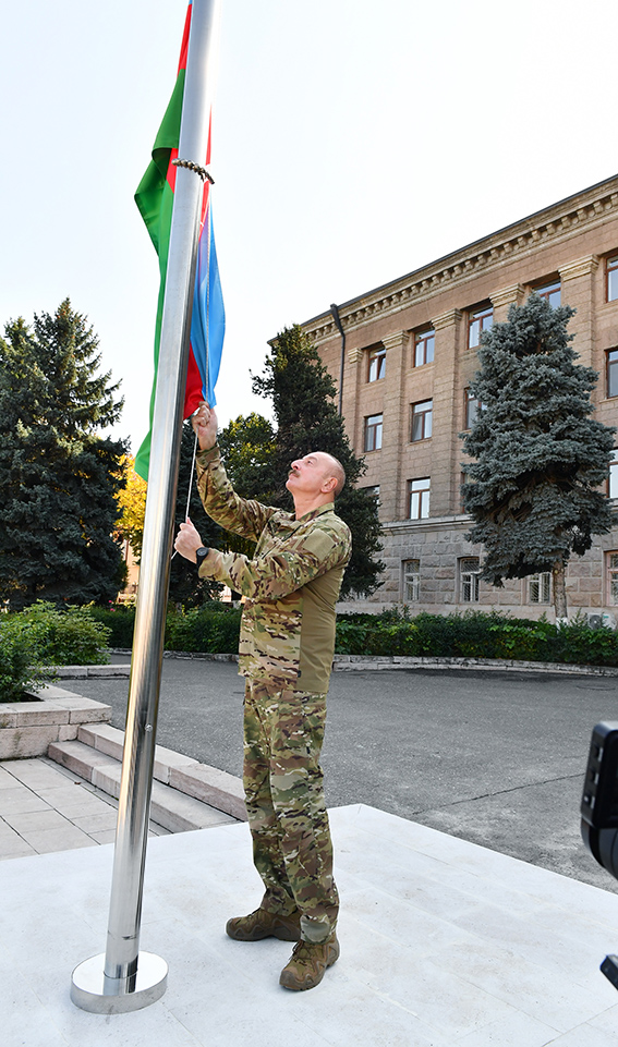 Azərbaycan Respublikasının Prezidenti İlham Əliyev 2023-cü il oktyabrın 15-də Xankəndi şəhərində Azərbaycan Respublikasının Dövlət Bayrağını ucaltdı. Prezident İlham Əliyev vəzifə borcunu yerinə yetirməyə başlayanda qarşısında bir nömrəli vəzifə qoymuşdur ki, Azərbaycan Bayrağı o vaxt işğal altında olan bütün ərazilərdə, bütün torpaqlarda, bütün şəhər və kəndlərdə qaldırılsın: “Hər gün, hər saat biz bu müqəddəs məqsədə doğru gedirdik. Hər gün biz bu müqəddəs anı yaxınlaşdırırdıq”.