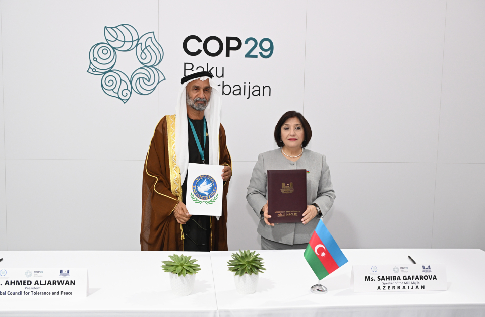 COP29 çərçivəsində keçirilən Parlament Görüşündə Azərbaycan Respublikasının Milli Məclisi ilə Qlobal Tolerantlıq və Sülh Şurası arasında Anlaşma Memorandumu imzalanıb.