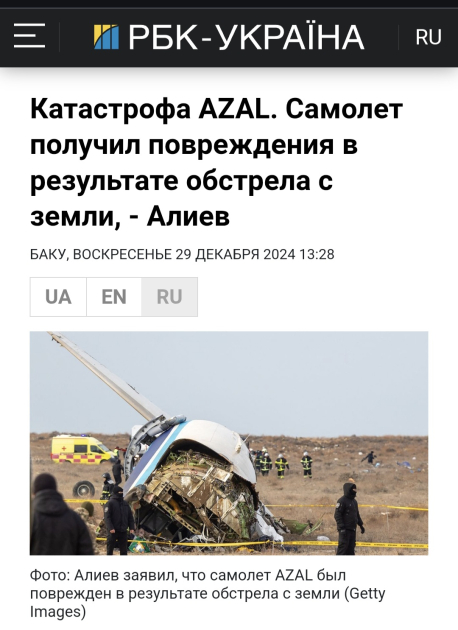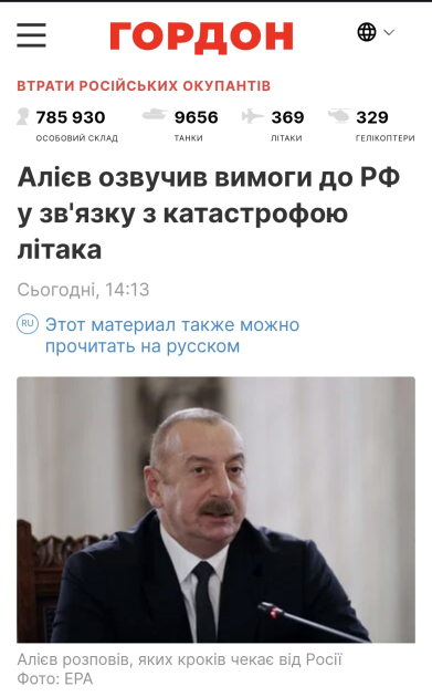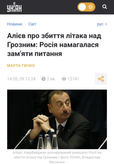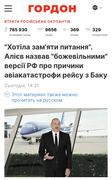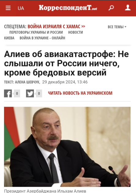 Ukrayna mətbuatı Prezident İlham Əliyevin təyyarə qəzası ilə bağlı fikirlərinə geniş yer ayırıb