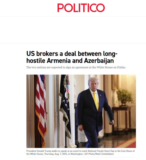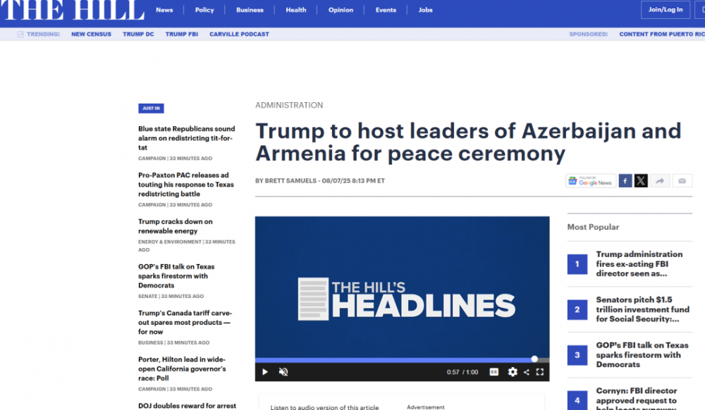 “The Hill” nəşri Azərbaycan Prezidenti İlham Əliyev və Ermənistanın baş naziri Nikol Paşinyanın Vaşinqton görüşünü tarixi hadisə adlandırıb və qeyd edib ki, Prezident Donald Tramp uzun illərdir düşmən olan bu iki ölkə arasında sülh nail olunması səylərini yüksək qiymətləndirir. İmzalanması gözlənilən razılaşma ABŞ-ın iki ölkənin Sovet İttifaqından müstəqillik əldə etdikdən sonra yaranan münaqişəyə son qoymaq üçün onilliklər ərzində göstərdiyi səylərin kulminasiya nöqtəsidir. Vaşinqton Azərbaycanın əsas hissəsini Naxçıvan eksklavı ilə birləşdirəcək “Beynəlxalq sülh və rifah üçün Tramp marşrutu” adlanan dəhlizə böyük əhəmiyyət verir. Ermənistan ABŞ-a Zəngəzur dəhlizinin 99 il müddətinə eksklüziv xüsusi inkişaf hüquqlarının verilməsinə razılıq verib. ABŞ torpağı dəmir yolu, neft, qaz və fiber-optik xətləri və 27 millik dəhliz boyunca elektrik enerjisinin ötürülməsini inkişaf etdirəcək konsorsiuma subicarəyə verəcək.
