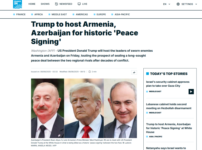 “France24” telekanalının saytında dərc olunan məqalədə Donald Trampın danışıqlarla bağlı fikirləri yer alıb, həmçinin Azərbaycan Prezidenti İlham Əliyevin Vaşinqtonda ABŞ Prezidentinin xüsusi elçisi Stiv Uitkoff ilə görüşü barədə məlumat verilib. Qeyd olunub ki, görüş əsnasında Azərbaycanın SOCAR və ABŞ-ın “ExxonMobil” şirkətləri arasında “Əməkdaşlıq haqqında Memorandum” imzalanıb. Tərəflər, həmçinin Azərbaycan liderinin ABŞ Prezidenti Donald Trampın dəvəti ilə Vaşinqtona işgüzar səfərinin ikitərəfli münasibətlərin gündəliyinin və regional məsələlərin müzakirəsi üçün yaxşı fürsət yaratdığını bildiriblər, Ermənistanla Azərbaycan arasında normallaşma prosesi və regiondakı sülh gündəliyinə dair fikir mübadiləsi aparıblar.