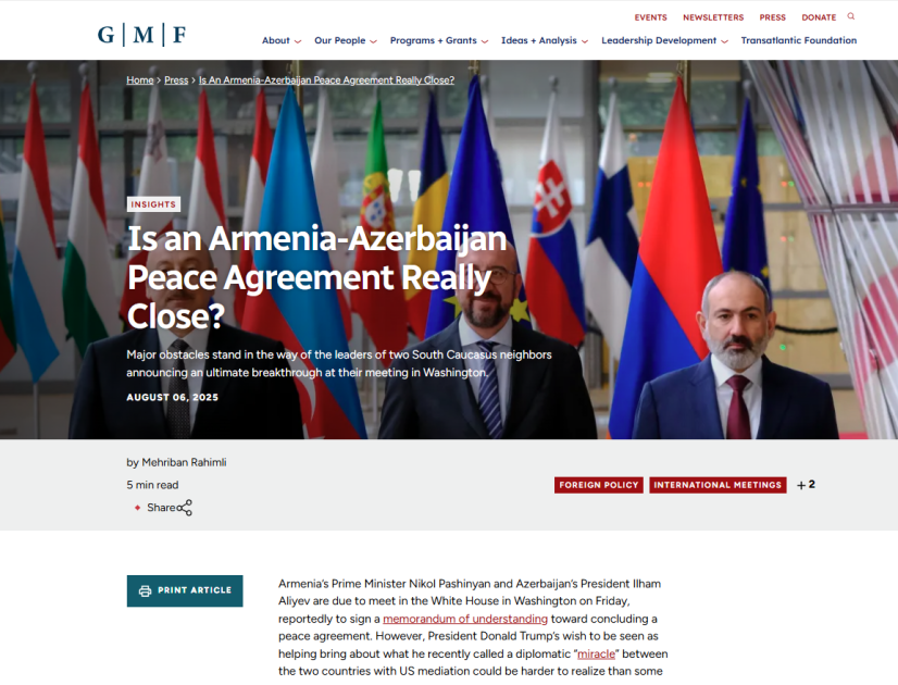 ABŞ-ın Alman Marşal Fondunun (GMF) saytında dərc olunan məqalədə qeyd olunur ki, Ermənistan və Azərbaycan may ayında sülh sazişi layihəsinin mətni üzərində razılaşdıqlarını bildiriblər. Bununla belə, Azərbaycan rəsmiləri layihənin tezliklə paraflanması ilə bağlı daha çox danışırlar. Bu əlavə prosessual addım siyasi baxımdan eskalasiya riskini müəyyən qədər azalda bilər. Azərbaycan tələb edir ki, Ermənistan konstitusiyasından ərazi iddiaları ehtiva edən bənd çıxarılsın, həmçinin iki ölkə Avropada Təhlükəsizlik və Əməkdaşlıq Təşkilatına (ATƏT) birgə məktub göndərərək 1992-ci ildə onlar arasında münaqişənin sülh yolu ilə həllini asanlaşdırmaq üçün yaradılmış Minsk qrupunu ləğv etməyi xahiş edir.