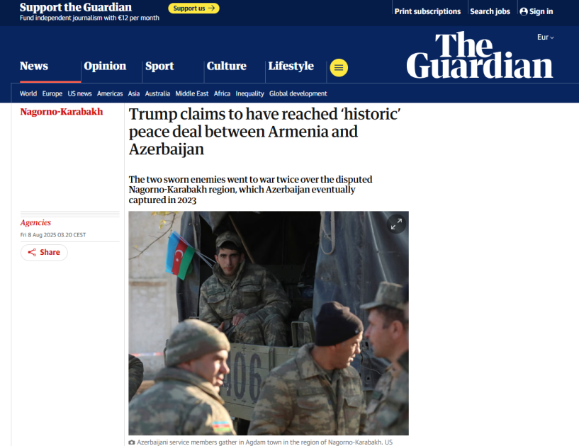 “The Guardian” nəşrinin “Tramp Azərbaycanla Ermənistan arasında tarixi sülh sazişinə nail olacağını iddia edir” sərlövhəli məqaləsində qeyd olunur ki, ABŞ Prezidenti Donald Tramp cümə günü Ermənistan və Azərbaycan liderlərini iki keçmiş sovet respublikası arasında onilliklərlə davam edən hərbi əməliyyatlara son qoymaq məqsədi daşıyan “Tarixi sülh sammiti”nə ev sahibliyi edəcəyini açıqlayıb. “İki ölkə keçən ay Birləşmiş Ərəb Əmirliklərində də sülh sazişi ilə bağlı danışıqlar apardılar, lakin sıçrayışın çətin olduğu sübut edildi. ABŞ Prezidenti bununla əlaqədar deyib: “Bir çox lider indiyə qədər müharibəyə son qoymağa çalışdı, heç bir uğur əldə etmədilər. Mənim administrasiyam kifayət qədər uzun müddətdir ki, hər iki tərəflə əməkdaşlıq edir, doğru şey etdikləri üçün bu cəsur liderlərlə fəxr edirəm”.