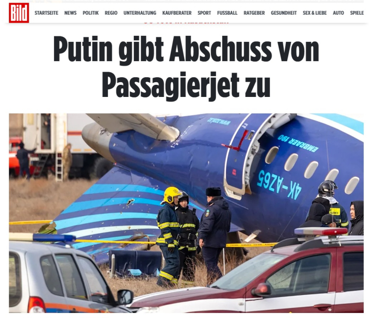Almaniyanın nüfuzlu media orqanları Rusiya Prezidenti Vladimir Putinin Düşənbədə Azərbaycan Prezidenti İlham Əliyev ilə görüşdə “Azərbaycan Hava Yolları” QSC-nin (AZAL) təyyarəsinin qəzaya uğramasına görə Rusiya hava hücumundan müdafiə qüvvələrinin məsuliyyət daşımasını ilk dəfə etiraf etməsindən yazıb.
