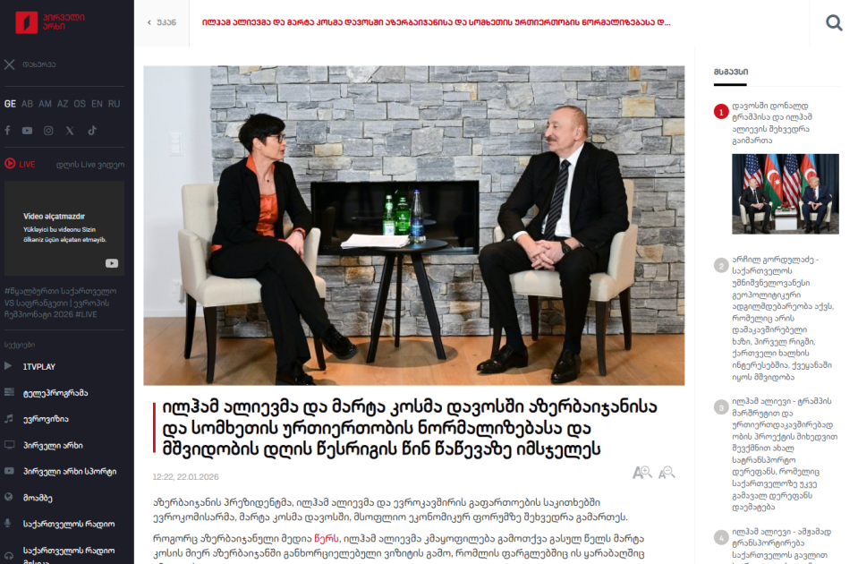AZƏRTAC xəbər verir ki, “interpressnews.ge”, “1tv.ge”, “qafqazturk.com”, “bpn.ge”, “radiotavisupleba.ge” portalları, “1.tv” televiziya kanalı və “radiotavisupleba” radiosu Azərbaycan Prezidentinin ABŞ Prezidenti Donald Tramp, Avropa İttifaqının Genişlənmə üzrə komissarı Marta Kos və digər şəxslərlə görüşündən xəbərlər yayıblar.