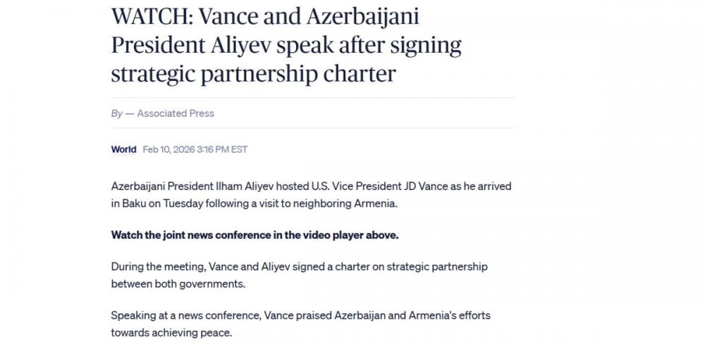 Bununla yanaşı, “Reuters”də dərc olunmuş “ABŞ və Azərbaycan Vensin səfəri çərçivəsində strateji tərəfdaşlıq müqaviləsi imzalayıblar” sərlövhəli yazıda qeyd olunur ki, Azərbaycan Prezidenti İlham Əliyev mətbuata birgə bəyanat zamanı ABŞ və Azərbaycan arasında münasibətlərin bu gün tamamilə yeni mərhələyə qədəm qoyduğunu deyib. Yazıya əsasən, Vens bildirib ki, ABŞ Azərbaycana ərazi sularını qorumaq üçün gəmilər göndərəcək. Vurğulanır ki, Xartiya ilk dəfə avqust ayında Vaşinqtonda Prezident İlham Əliyevlə Prezident Donald Tramp arasında danışıqlarda təqdim olunub.