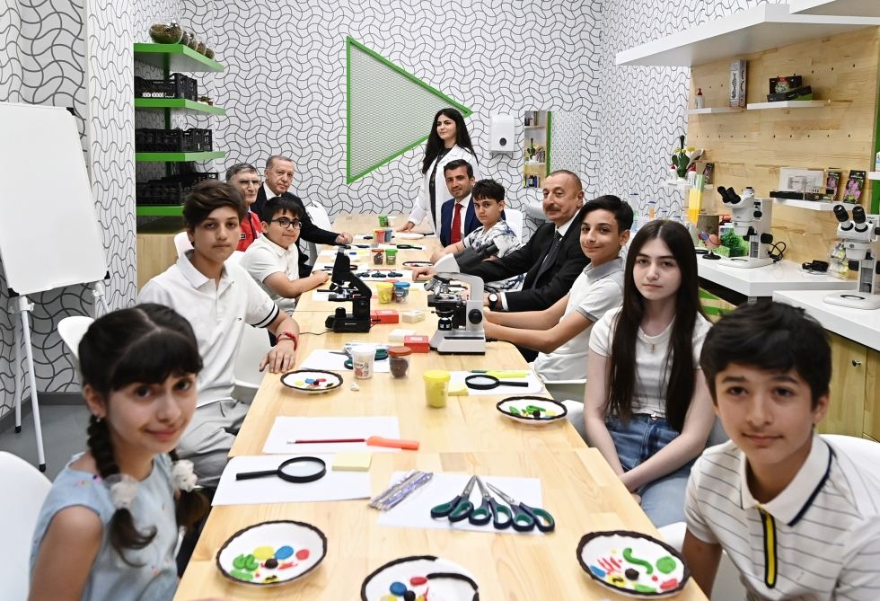 Президенты Ильхам Алиев и Реджеп Тайип Эрдоган побеседовали с учащимися, проводящими опыты в лаборатории.