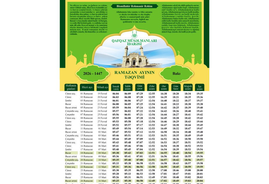 İftar və imsak vaxtları CƏDVƏL