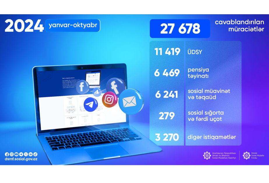 Dövlət Sosial Müdafiə Fondunun (DSMF) fəaliyyət istiqamətləri üzrə sosial şəbəkələr vasitəsilə bu ilin yanvar-oktyabr ayları ərzində 27 min 678 vətəndaş müraciəti cavablandırılıb.