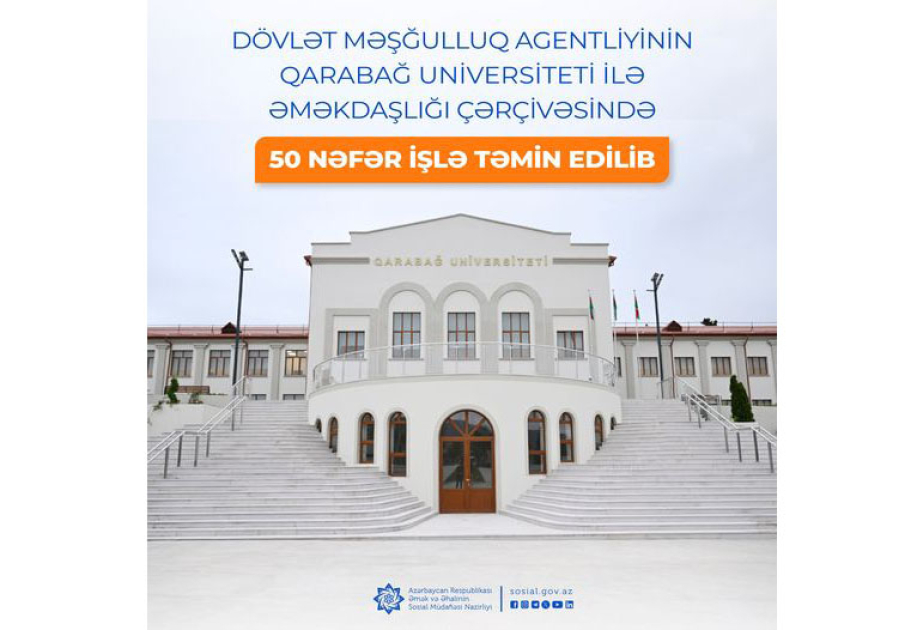 Nazirliyin İctimaiyyətlə əlaqələr şöbəsindən AZƏRTAC-a verilən məlumata görə, Agentliyin göndərişi əsasında 50 nəfər Qarabağ Universitetində mövcud olan vakansiyalar üzrə işlə təmin edilib.