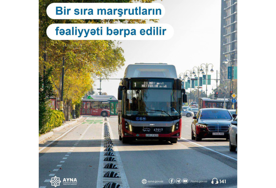 Rəqəmsal İnkişaf və Nəqliyyat Nazirliyinin tabeliyindəki Azərbaycan Yerüstü Nəqliyyat Agentliyi (AYNA) daha iki avtobus marşrutunun fəaliyyətini bərpa edir.