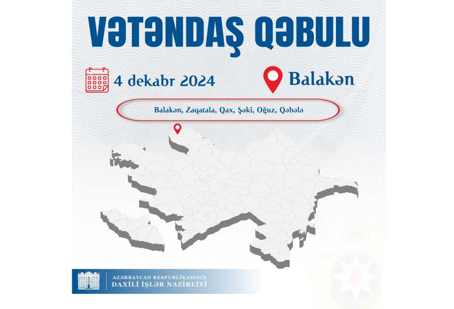 Azərbaycan Respublikasının daxili işlər naziri general-polkovnik Vilayət Eyvazov dekabrın 4-də Balakən Rayon Polis Şöbəsinin inzibati binasında Balakən, Zaqatala, Qax, Şəki, Oğuz, Qəbələ şəhər və rayonlarının sakinlərinin qəbulunu keçirəcək. Bu barədə Daxili İşlər Nazirliyinin (DİN) mətbuat xidmətindən məlumat verilib. Bildirilib ki, qəbula yazılmaq istəyən vətəndaşlar DİN-in səlahiyyətlərinə aid məsələlərlə bağlı dekabrın 3-dək yaşadıqları ərazinin polis orqanına, habelə DİN-in mia.gov.az internet saytı vasitəsilə və sosial şəbəkələrdəki səhifələrinə müraciət edə bilərlər.
