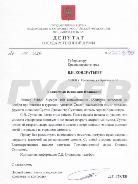 AZƏRTAC xəbər verir ki, “Azimut” aviaşirkətinə məxsus sərnişin təyyarəsi noyabrın 24-də Türkiyənin Antalya şəhərində eniş edərkən alovlanıb. Krasnodar sakini, azərbaycanlı Sultan Sultanov sərnişinləri xilas etməyə kömək edib. O, eyni reyslə uçurmuş və yanğın başlayandan sonra gənc stüardessanın təşviş içində olduğunu, təcili çıxışı aça bilmədiyini görüb. Sultan qapını açmağa kömək edib və ekipaj üzvləri ilə birlikdə uşaqları və böyükləri yanan təyyarədən çıxarıb.