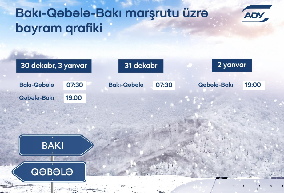 “Azərbaycan Dəmir Yolları” (ADY) QSC qarşıdan gələn bayram günlərində sərnişin tələbatını təmin etmək məqsədilə yanvarın 3-də Bakıdan Qəbələyə və Qəbələdən Bakıya əlavə qatar reysləri təyin edir.