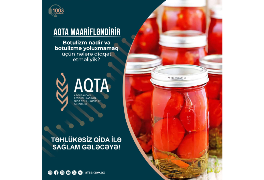 Azərbaycan Qida Təhlükəsizliyi Agentliyinin İnformasiya təminatı və innovativ həllər şöbəsindən AZƏRTAC-a verilən məlumata görə, həmin hallarda “botulizm” adlanan qida zəhərlənmələri baş verə bilər.