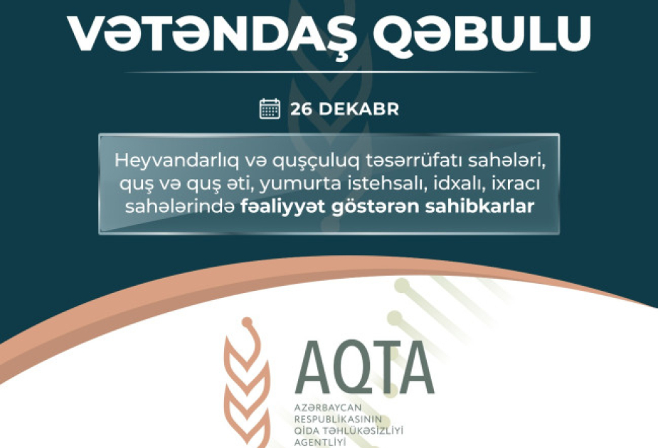 Azərbaycan Qida Təhlükəsizliyi Agentliyinin (AQTA) sədri Qoşqar Təhməzli dekabrın 26-sı saat 15:30-da heyvandarlıq və quşçuluq təsərrüfatı sahələri, quş və quş əti, yumurta istehsalı, idxalı, ixracı sahələrində fəaliyyət göstərən sahibkarlarla görüşəcək.