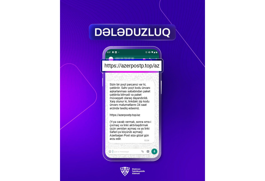 AZƏRTAC Elektron Təhlükəsizlik Xidmətinin məlumatına istinadla xəbər verir ki, kiberdələduzlar vətəndaşlara mesajlar göndərərək ünvan məlumatlarının düzgün olmaması səbəbindən paketin çatdırılmadığını qeyd edirlər. Digər tərəfdən 24 saat ərzində mesajdakı keçidə daxil olaraq, linkdəki zip kodu və ünvan məlumatlarını təsdiq etmək tələb olunur.