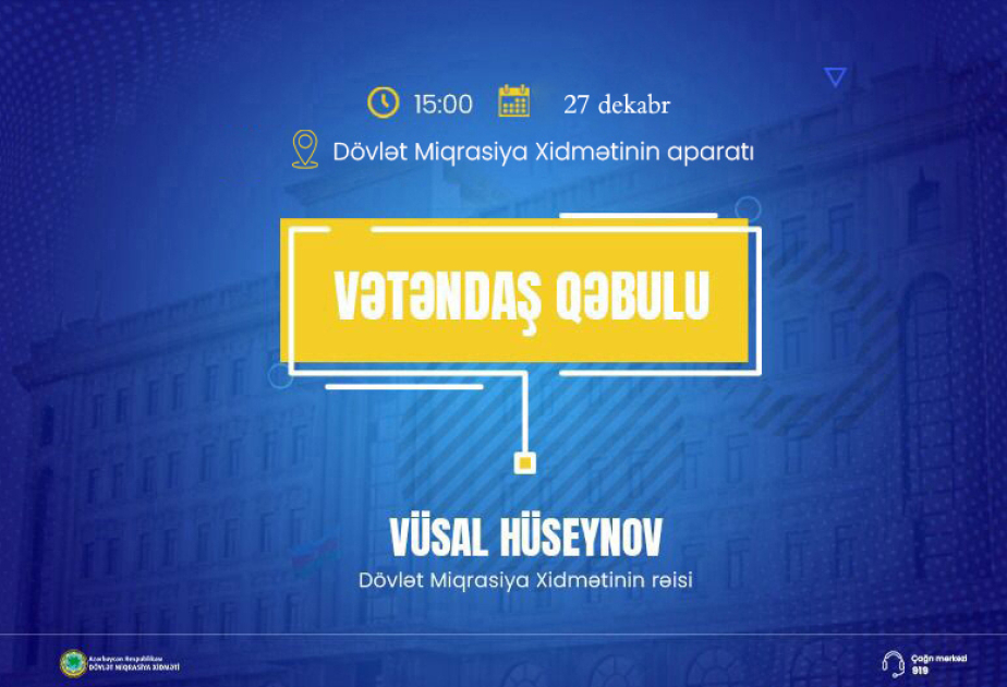 Dövlət Miqrasiya Xidmətinin rəisi Vüsal Hüseynov dekabrın 27-si saat 15:00-da Xidmətin aparatında vətəndaşlarla görüşəcək.